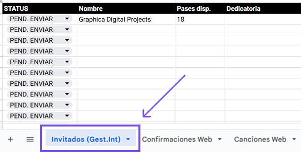 Solo debes editar la pestaña «Invitados (Gestión interna)«. Las demás pestañas se completarán dinámicamente cuando tus invitados empiecen a enviar sus confirmaciones.